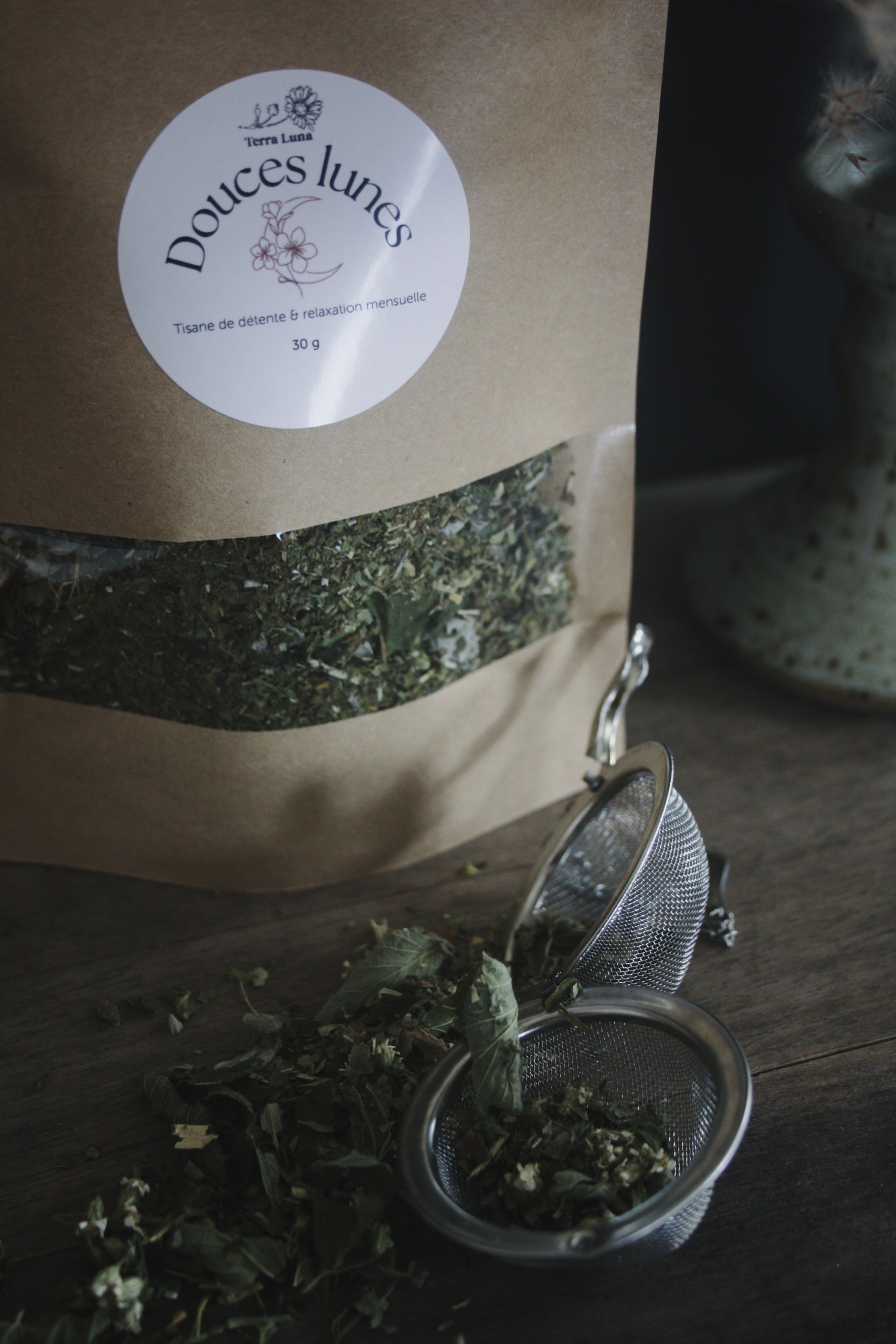 Parties aériennes d’Alchémille (Alchemilla vulgaris), feuilles de Framboisier (Rubus idaeus), fleurs d’Achillée millefeuille (Achillea millefolium), feuilles de Scutellaire (Scutellaria lateriflora), feuilles de Mélisse (Melissa officinalis).